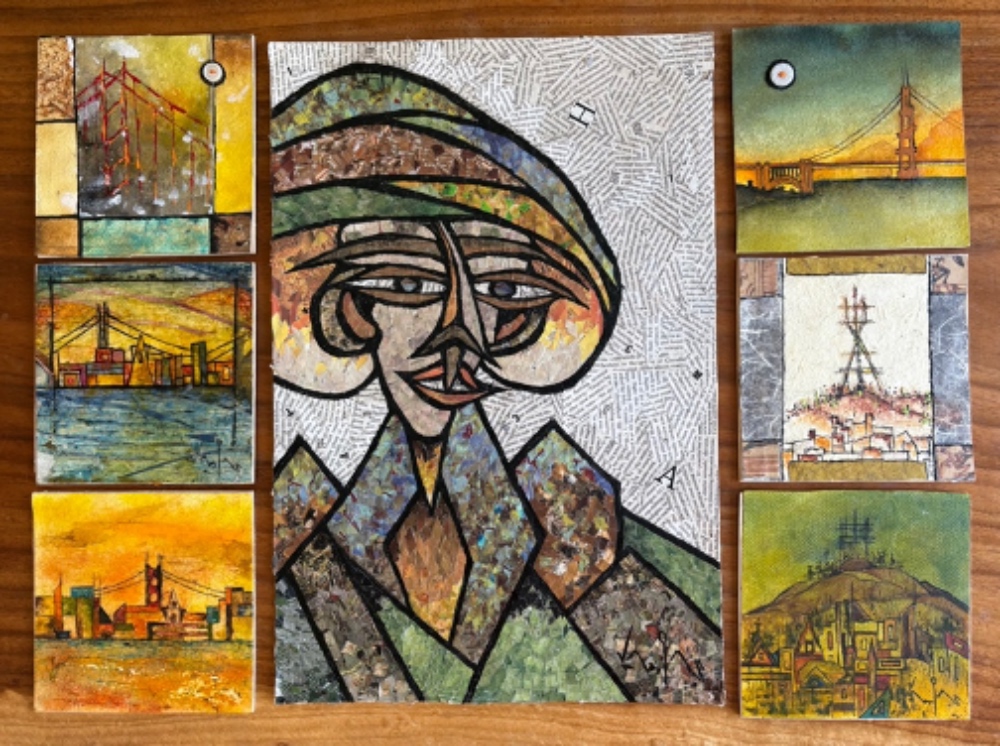 Juan’s been busy this spring and summer, and has a good assortment of watercolors, acrylics, and collage, in varied sizes and techniques. There will also be bookmarks and stickers produced by his niece.